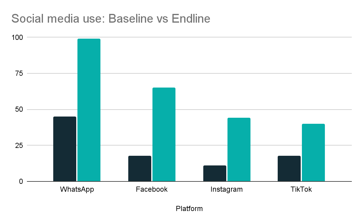The use of social media for business increased significantly after the Digital Cubs program, with WhatsApp becoming nearly universal and strong growth in Facebook, Instagram, and TikTok use. On average, each woman was using almost three social media platforms by the end of the program, reflecting stronger marketing skills and greater confidence compared to baseline, when social media use for business was still limited.